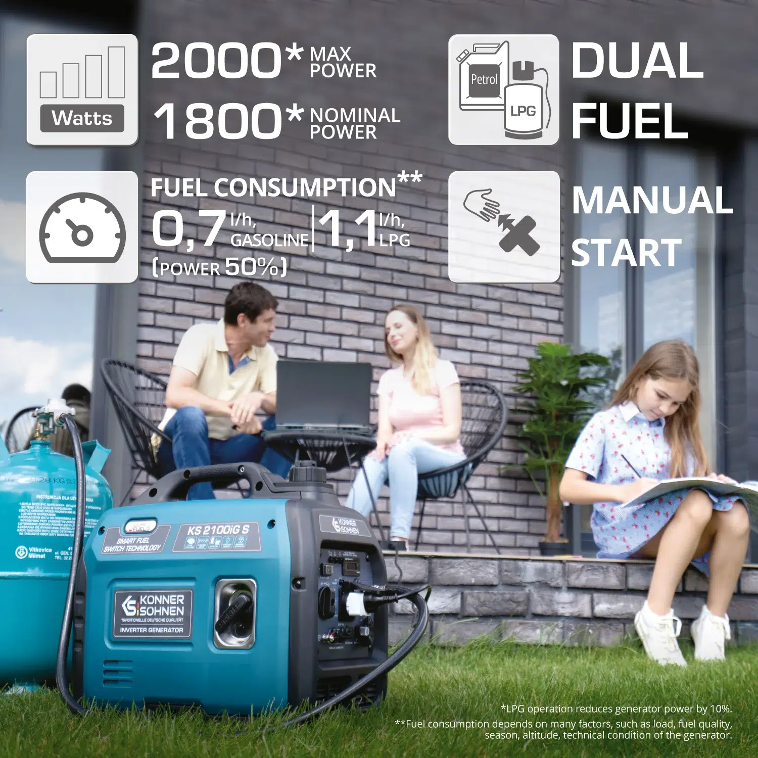 De KS 2000iG S is een lichte en krachtige inverter generator met dual fuel-optie: LPG én benzine. Perfect voor kamperen, noodstroomvoorziening of gebruik bij gevoelige apparatuur. Met een continu vermogen van 1,8 kW (maximaal 2,0 kW) levert deze generator stabiele en veilige stroom, waar je ook bent.